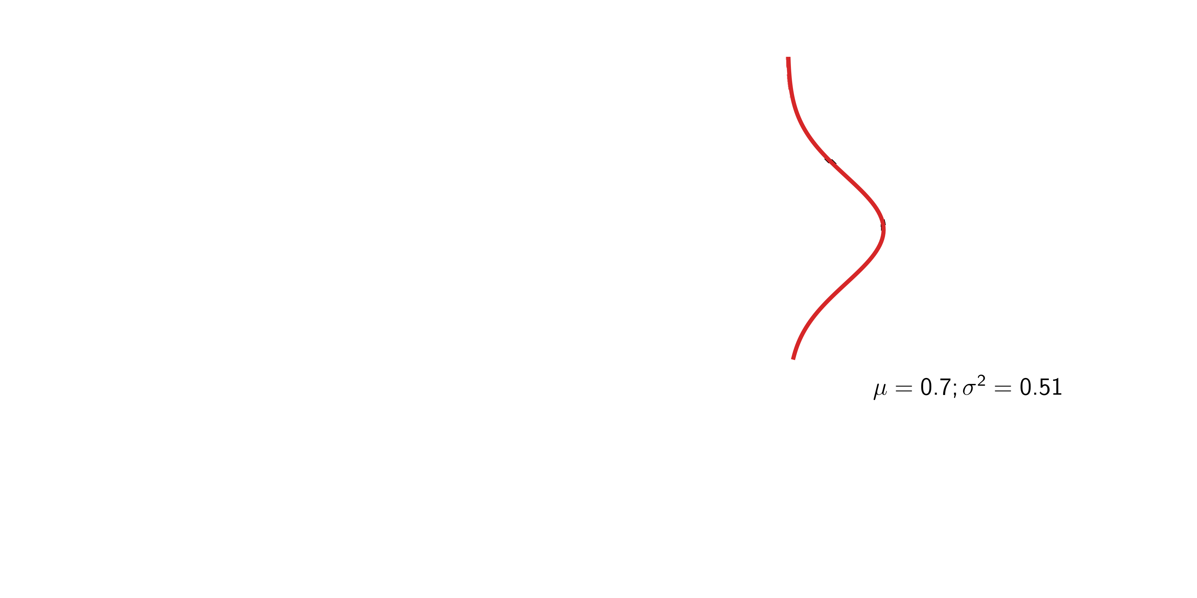 \[ \begin{aligned} p(\textcolor{output}{y}_\star = 1 \mid {\textcolor{output}{\boldsymbol{y}}}) &= \int \sigma(\textcolor{latent}{f}_\star) p(\textcolor{latent}{f}_\star \mid {\textcolor{output}{\boldsymbol{y}}}) \dd{\textcolor{latent}{f}_\star} \\ &= \int \sigma(\textcolor{latent}{f}_\star) {\mathcal{N}}(\textcolor{latent}{f}_\star \mid {\boldsymbol{\mu}}, {\boldsymbol{\Sigma}}) \dd{\textcolor{latent}{f}_\star} \end{aligned} \]