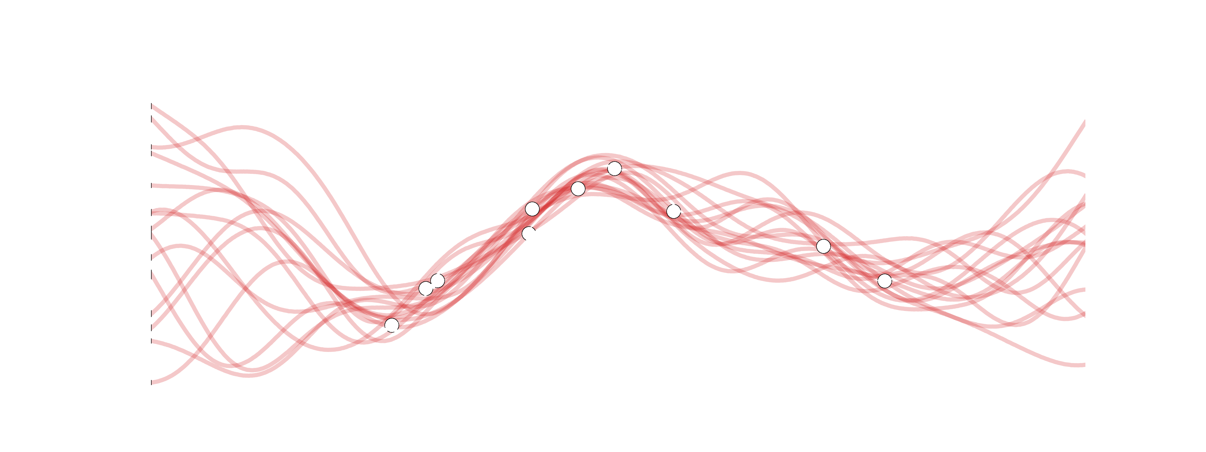 Let’s be explicit about the hyperparameters \({\textcolor{params}{\boldsymbol{\theta}}}\) of the kernel function \(k(\cdot, \cdot)\): \[ p({\textcolor{output}{\boldsymbol{y}}}\mid {\textcolor{params}{\boldsymbol{\theta}}}) = \int p({\textcolor{output}{\boldsymbol{y}}}\mid {\textcolor{latent}{\boldsymbol{f}}}, {\textcolor{params}{\boldsymbol{\theta}}})p({\textcolor{latent}{\boldsymbol{f}}}\mid {\textcolor{params}{\boldsymbol{\theta}}}) \dd{\textcolor{latent}{\boldsymbol{f}}}= {\mathcal{N}}({\textcolor{output}{\boldsymbol{y}}}\mid {\boldsymbol{0}}, {\boldsymbol{K}}+ \sigma^2{\boldsymbol{I}}) \]