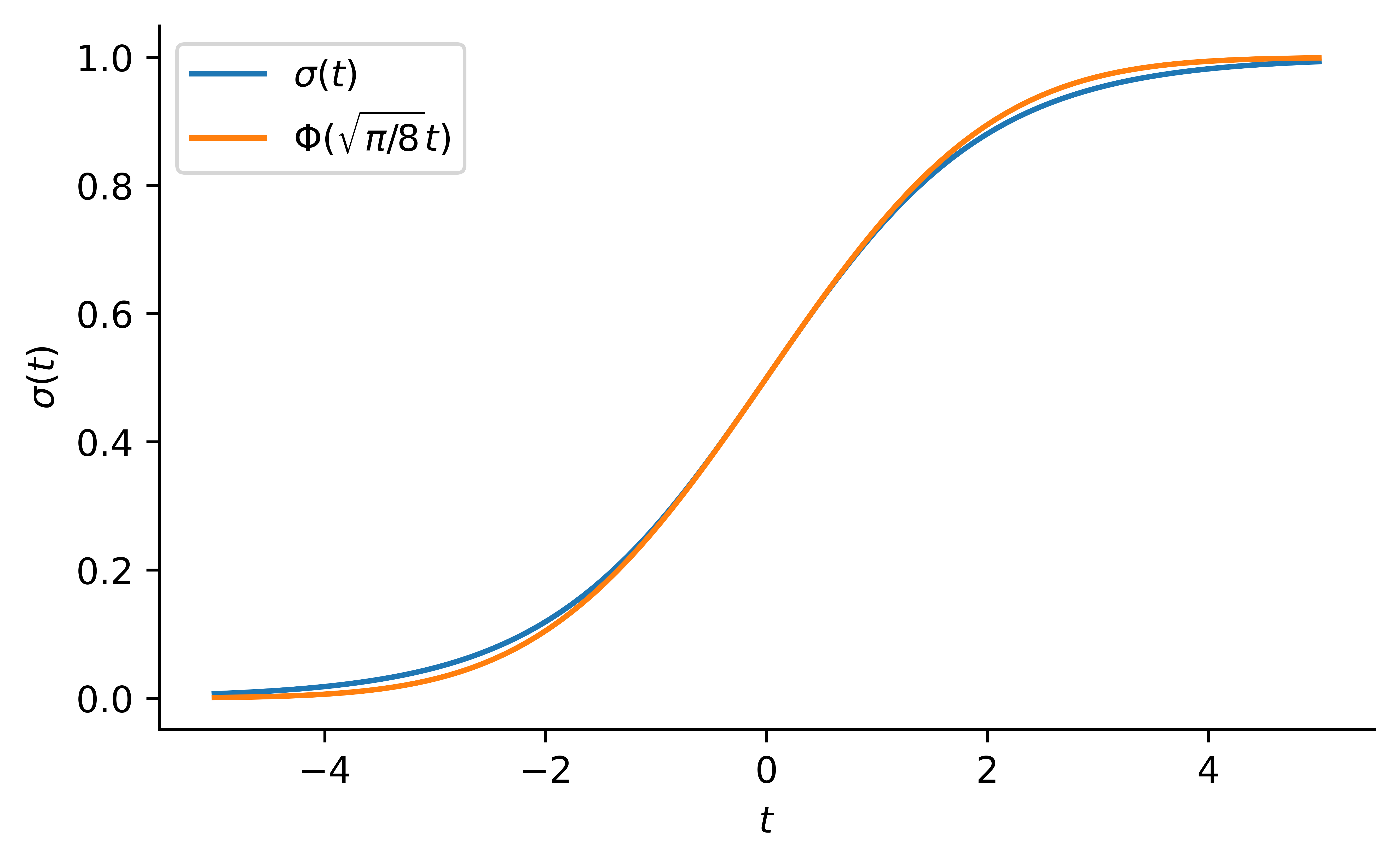 Logistic function \(\sigma(t)\) is approximated by the cumulative distribution function of a Gaussian \(\Phi(\lambda t)\), where \(\lambda = \sqrt{\pi/8}\).