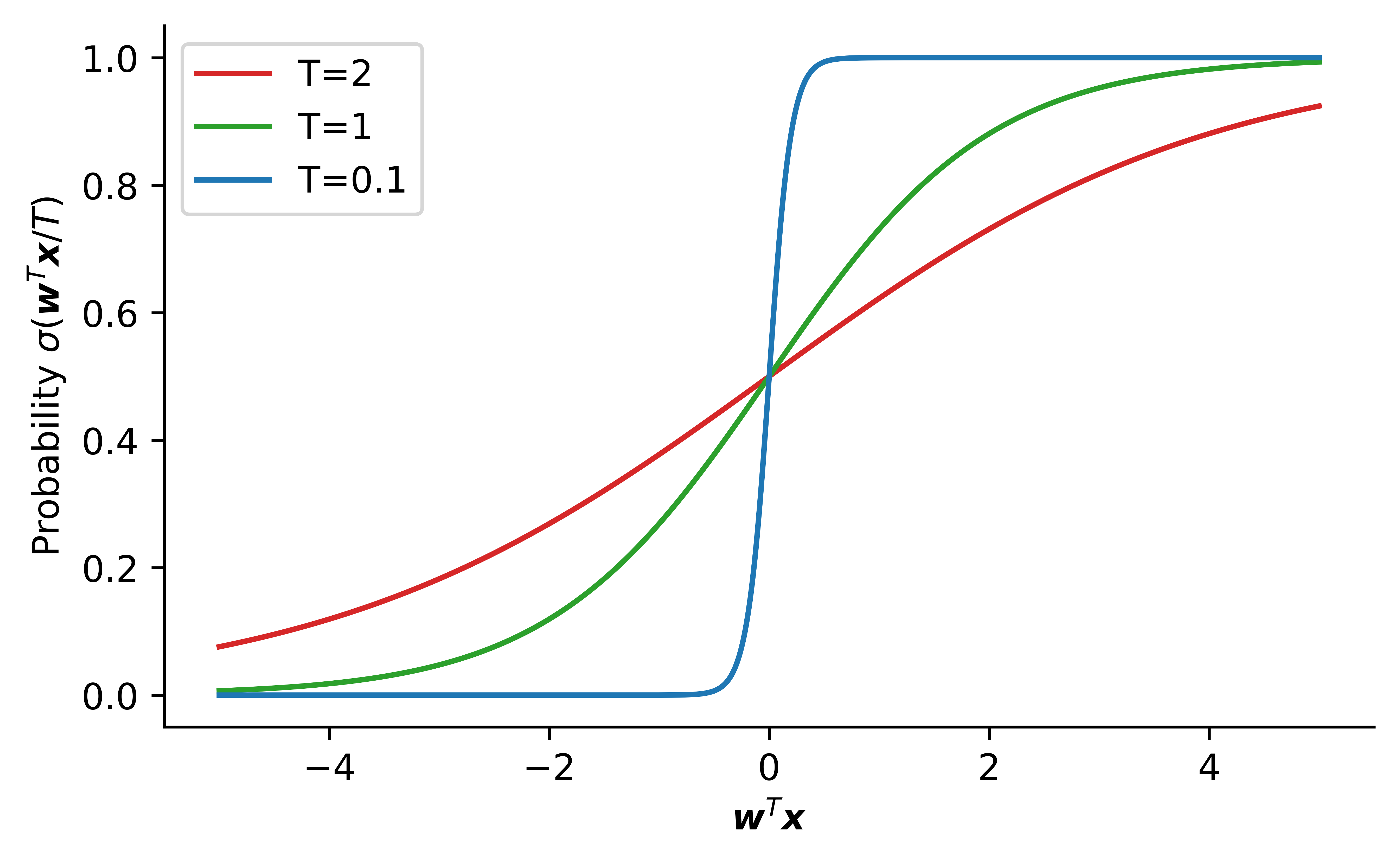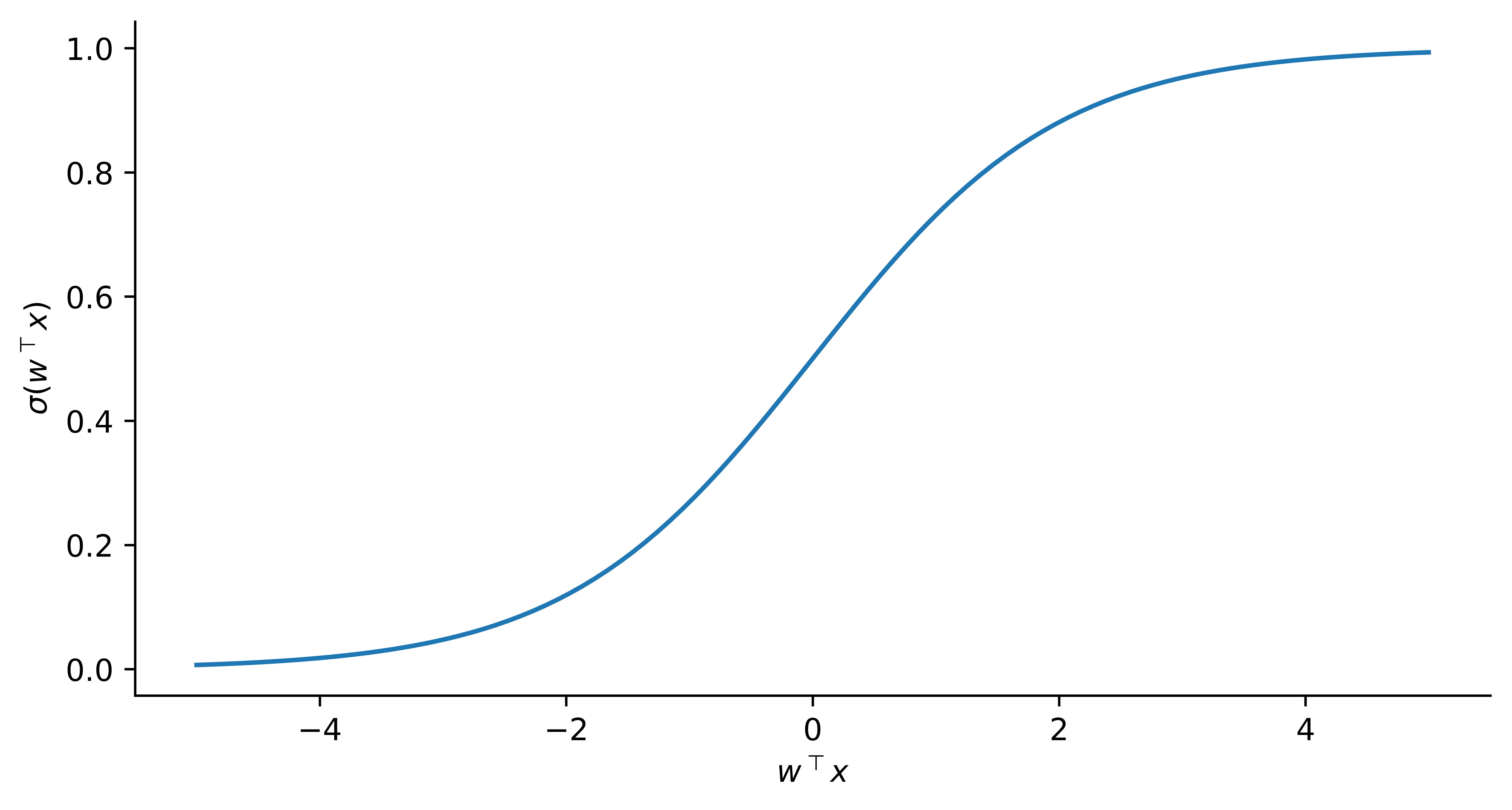 \[ P(\textcolor{output}{y} = 1 \mid {\textcolor{input}{\boldsymbol{x}}}) = \sigma({\textcolor{params}{\boldsymbol{w}}}^\top{\textcolor{input}{\boldsymbol{x}}}) = \frac{1}{1 + \exp(-{\textcolor{params}{\boldsymbol{w}}}^\top{\textcolor{input}{\boldsymbol{x}}})} \]