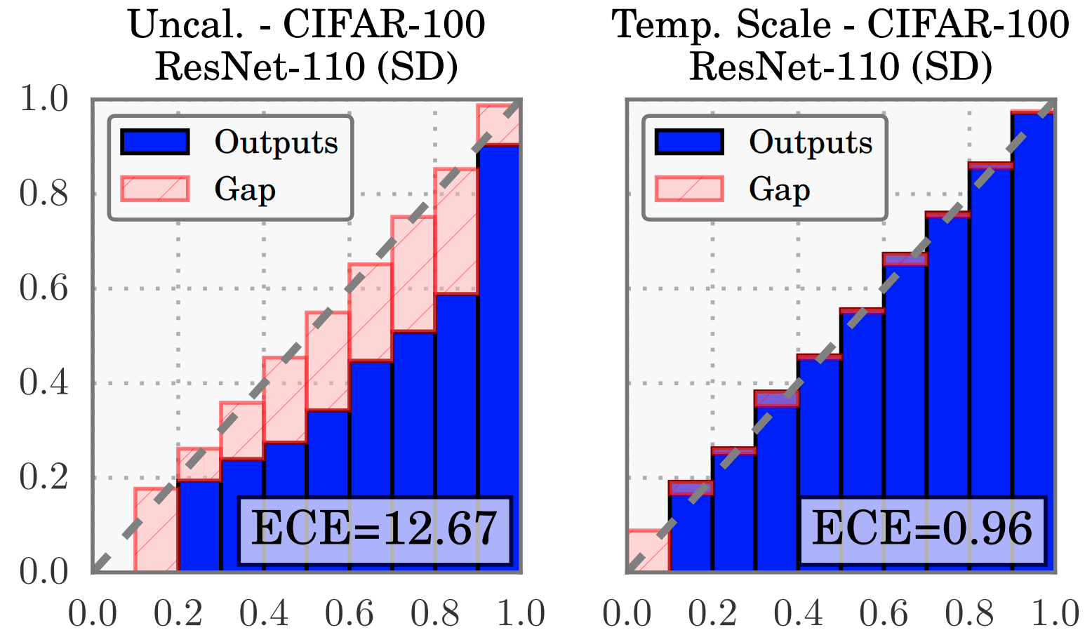 Expected calibration error (ECE) measures “how much” the predicted probabilities deviate from the true probabilities.